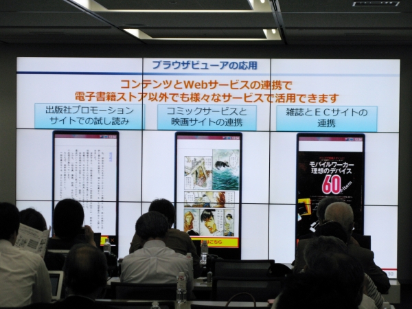 デジタル情報家電事業本部モバイルソリューション事業部事業部長辰巳剛司氏は、今後の電子書籍応用事業について、「紙媒体を中心で作られるカタログ、店頭POPなどの販促ツールなど企業活動シーンでの技術応用にも取り組みシェア拡大を目指す」と述べた。