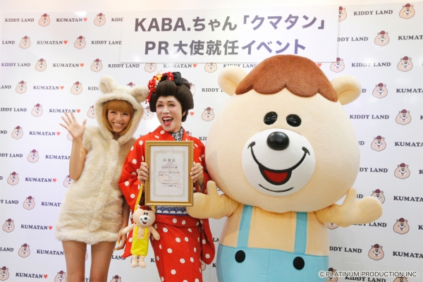 PR大使就任式では、日本髪にクマタンの髪飾り、赤地に水色のドットの着物という艶やかな着物 姿のKABA.ちゃんと、クマをイメージした全身ファーの耳つきの衣装をまとった若槻さん、クマタンが3 人で登場。若槻さんからKABA.ちゃんに「PR大使任命証」が直接手渡された。