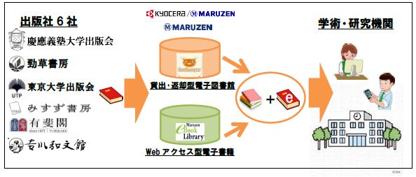 丸善㈱、京セラ丸善システムインテグレーション㈱(以下KMSI)と、人文社会系主要出版社である慶應義塾大学出版会㈱、㈱勁草書房、一般財団法人東京大学出版会、㈱みすず書房、㈱有斐閣、㈱吉川弘文館(以下出版社6社)は、2014年9月から、学術・研究機関を対象として学術書の新刊を冊子体と電子書籍のセットにて販売する「新刊ハイブリッドモデル」のサービスを開始することを発表した。