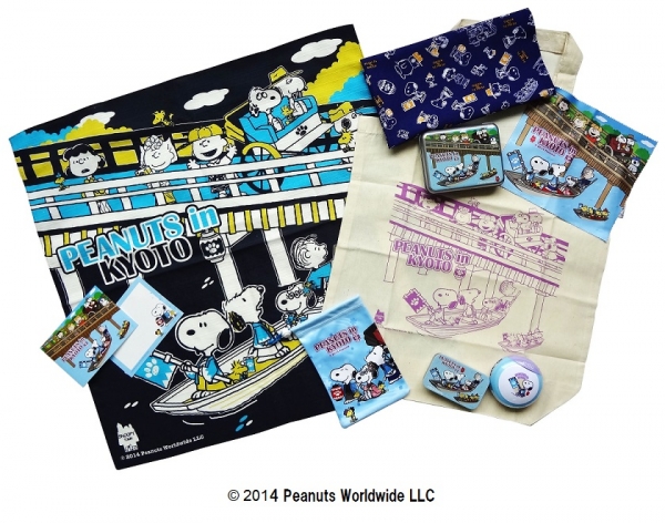 渡月橋をバックに桂川を舟で優雅に渡る新撰組風に扮したPEANUTSの仲間たちがデザインされた限定商品19 アイテム。ピンバッジセット 限定 200 個、湯のみ 限定 150 個、茶碗 限定 150 個、小風呂敷 限定 200 個などなど。