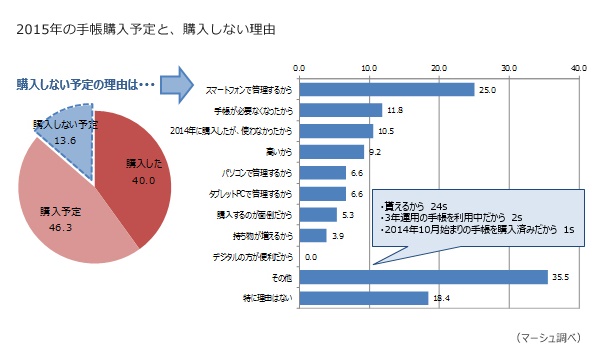 まず、事前調査で、2014年手帳保有者に、2015年も手帳を購入する予定かと尋ねたところ、「購入しない」と回答したのは1割強であった。そのうち、「スマートフォンで管理するから」は4人に1人となり、手帳からスマートフォンへ移行する人は、全体の僅か3%程度に留まる結果となった。