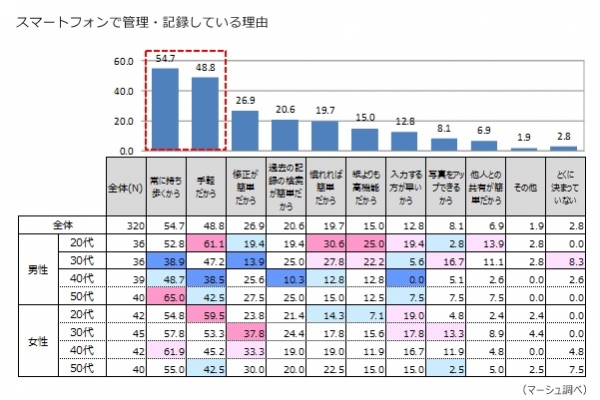 続いて、本調査では、紙の手帳で記録・管理している理由を尋ねたところ「慣れているから」が7割弱で最も高く、次いで「楽だから」が約半数となり、いずれかに回答している人が約8割を占めた。一方、スマートフォンで管理している理由については、「常に持ち歩くから」が最も高く、次いで「手軽だから」が続き、それぞれ半数前後となった。