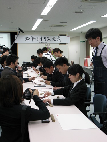 三菱鉛筆㈱は4月1日、東京・大井町の本社で、「第8回鉛筆けずり入社式」を行い、新入社員20人が、先輩社員に見守られる中、最初の仕事として小刀で鉛筆を削った。