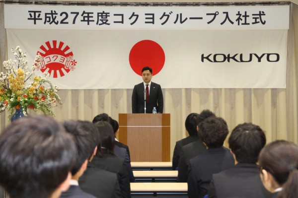 「私は先日、新たに社長に就任し皆さんと同じフレッシュな気持ちでここに立っています。2015年度のコクヨグループは持続的な成長のための課題解決に向けて体制を大きく変えるタイミングにあります。皆さんにも、新たなスタートを切る私たちの仲間に入っていただきご活躍いただきたい。そのためにはまず仲間を好きになってほしい。コクヨは皆で役割・責任を果たしながら助け合い、尊敬し合いながら仕事をしていく会社です。良い仲間が増えると自ずと目の前の仕事が好きになり、一層コクヨのことが好きになると私は思っています。経営を担う私達も、皆さんがコクヨで頑張りたい、お客様に対して良い価値を提供したい、コクヨを通じて良い人生にしたいと思ってもらえるように努力していくつもりです。これから共に頑張りましょう」