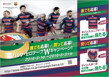 ニチバン㈱は、サッカー・スペインリーグの名門クラブ「FCバルセロナ」のサイン入りグッズや家電製品などが総計100名様に当たる「誰でも応募!買って応募! バルサ・セロテープ®Wキャンペーン!」を3月1日から5月31日まで実施。同キャンペーンは、オープンキャンペーンとクローズドキャンペーンの2本立て。