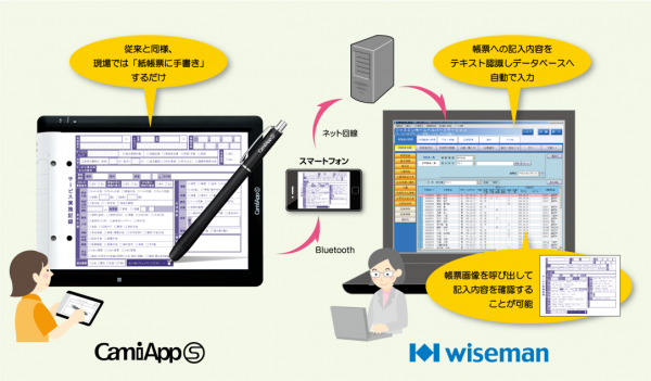 今回のソリューションは、デジタルノート「CamiApp S」(2014年発売)を用いて、現場の情報を「サービス提供記録」等の専用帳票に手書きで記入するだけで、介護請求ソフトへのデータ転送を可能にした。