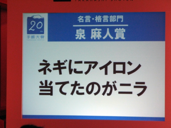名言・格言部門大賞には、相野正さんの「病室の夕陽より、やっぱり台所の朝陽ね」が受賞した。病気を乗り越えて、家族が後ろにいる台所から、朝陽のまぶしさを感じて、思わず妻が口にした一言。飾らない言葉だからこそ、日常生活に戻った時の感動が表現されていると評価された。