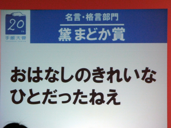 橋秀雄社長は、「第20回を迎え、この手帳大賞も多くの方に、恒例行事として認識されてきています。作品は、審査員に泉麻人(コラムニスト)、椎名誠(作家)、黛まどか(俳人)と共に厳選な審査を行い選出した。これからも、手帳大賞を30回、40回と長く続けられるよう、お力添えをお願いします」と挨拶した。