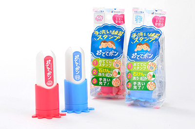 「おててポン」は、お子さまの手のひらにポンと“ばいきん”のイラストをスタンプし、印影がキレイに消えるまで石けんを使用してしっかり手洗いをすることで、上手な手洗いの練習ができる、新しい手洗い練習ツール。