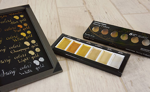「顔彩耽美 スターリーカラーズ」は、繊細な色味が作品の幅を広げてくれる、美しい金色ベースの顔彩絵の具です。隠ぺい性に優れ、白色の紙だけでなく、濃い色の紙にも上品に発色します。