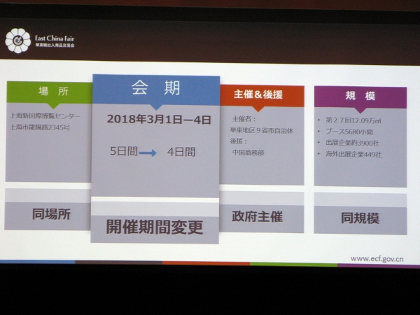 同展は、上海市、江蘇省、浙江省、安徽省、福建省、江西省、山東省、南京市、寧波市の九省市自治体商務委員会の共同主催。