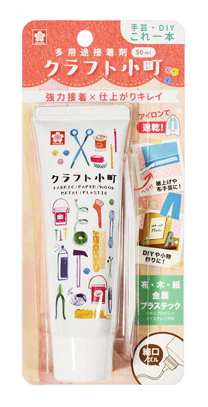 多用途接着剤「クラフト小町50ml」は、『こんな接着剤があったらいいな』の『こんな』を、ギュッとつめこんだ接着剤。
