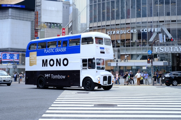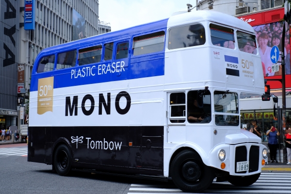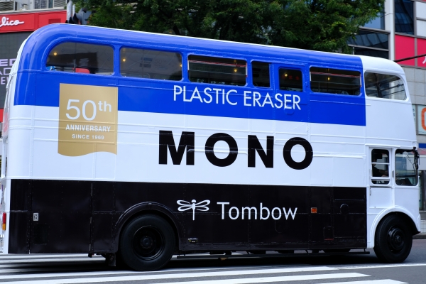 トンボ鉛筆は、モノカラー誕生50周年を記念して6月19日(水)~23日(日)、「モノ消しゴム」でラッピングされた2階建ロンドンバスが、渋谷・原宿・表参道を周遊します。