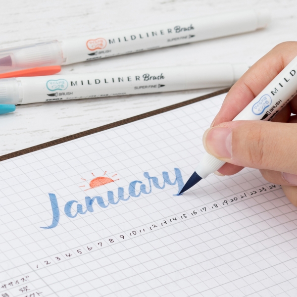 | カリグラフィーをオシャレに書けるカラー筆ペン『マイルドライナーブラッシュ』1本 \165(税抜価格 \150) |
