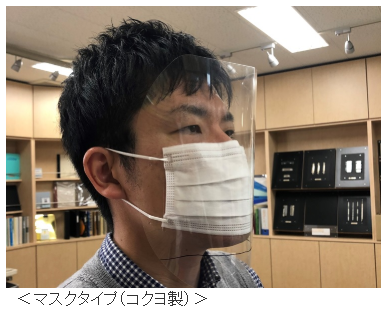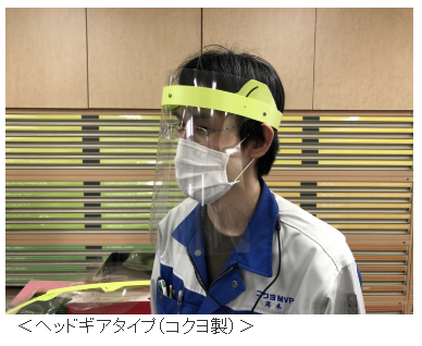 グループ会社の㈱コクヨMVPにて当該レールクリヤーホルダーに使用されているPET製のシートを活用し、自社の製造ノウハウを活かして簡易フェイスシールド(ヘッドギアタイプ、マスクタイプ)を製作し提供することとなった。