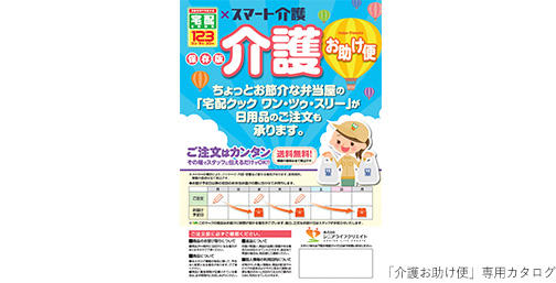お客様のご注文を弁当宅配時に受付し、その商品を注文の翌日以降で、一番早い弁当宅配日に同時にお届けいたします。注文は専用カタログから商品を選んで、弁当宅配時にスタッフに口頭で伝えるだけで完了でき、宅配弁当と一緒にお届けするため送料もかかりません。