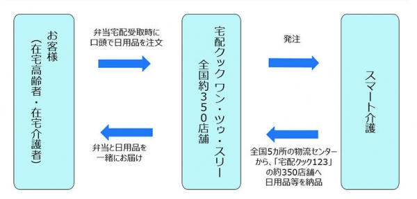 そうした声に応え、このたびシニアライフクリエイト社と連携し、日用品、高齢者向け商品、加工食品等の約200点をプラスの全国5カ所の配送センターから、「宅配クック ワン・ツゥ・スリー」の全国約350店舗へ翌日配送し、弁当とともにお届けする新サービス「介護お助け便」を展開。