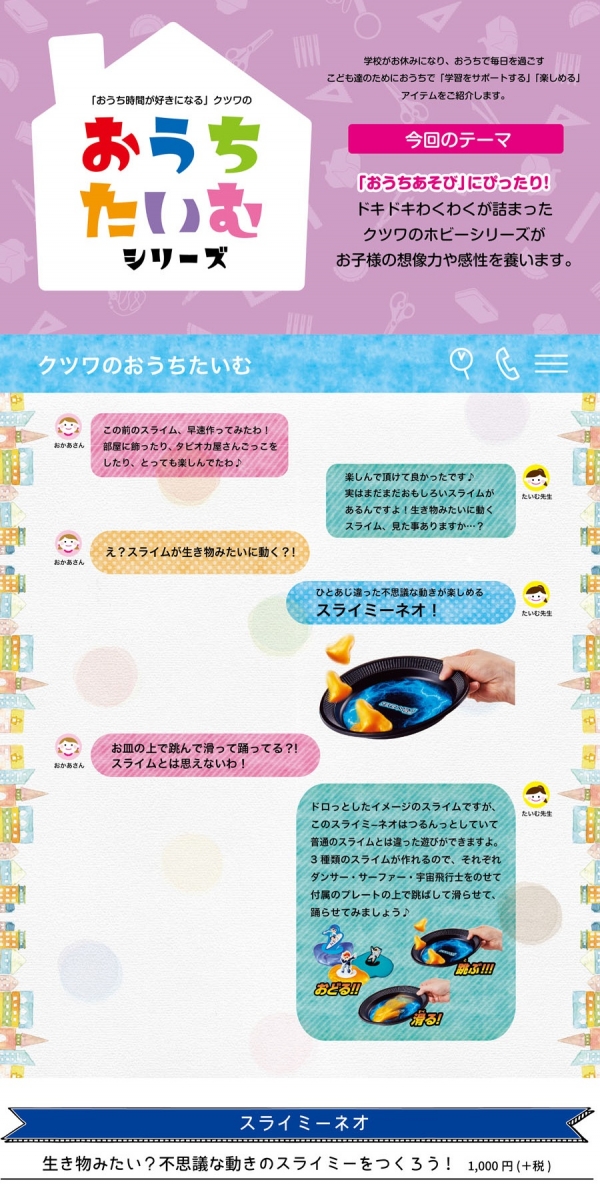 クツワは、販売促進の一環でダイレクトメールの配信を開始。5月は「おうちたいむ」と題し、外出自粛でおうちで過ごすこども達のために、おうち時間が楽しくなる商品を6回に分けて紹介した。6月もテーマとデザインを刷新して配信する。