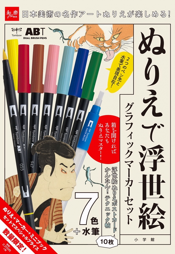 おうち時間が増え、ぬりえブームが到来するなか、買ってすぐに本格アートぬりえが楽しめる「ぬりえで浮世絵グラフィックマーカーセット」が、小学館より数量限定出版で7月16日頃発売される。本体価格2200円で、セットには、トンボ鉛筆の水性グラフィックマーカー「ABT」7色と水筆が付く。