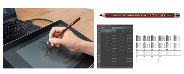 「CLIP STUDIO PAINT」に、「Hi-uniブラシ」をインストールすることで、ハイユニ全22硬度(10H~10B)の微妙な濃淡や強弱、鉛筆らしい「かすれ」具合などを、デジタル環境において忠実に再現しました。「Hi-uniブラシ」のデータは、Wacom One購入者に無料で提供されます。