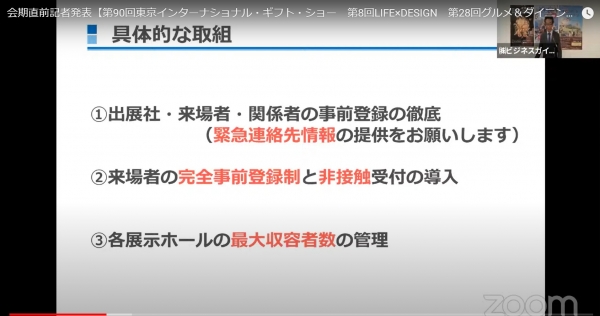 withコロナ時代において、万全な感染拡大防止対策を講じ、出展・来場者すべての関係者の安心・安全を第一に考えた会場づくり。三密の発生防止に重点においた、具体的な取り組みとして、出社社・来場者・関係者の事前登録の徹底(緊急連絡先情報の提供)。来場者の完全事前登録制と非接触受付の導入。展示ホール入口、出口で人数カウントし、最大収容者数を超えた場合は入場制限を行う。