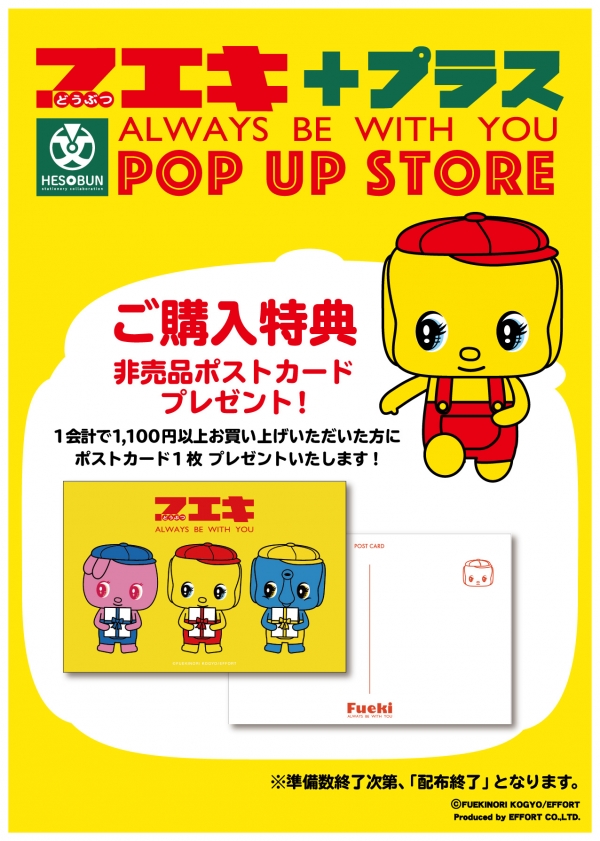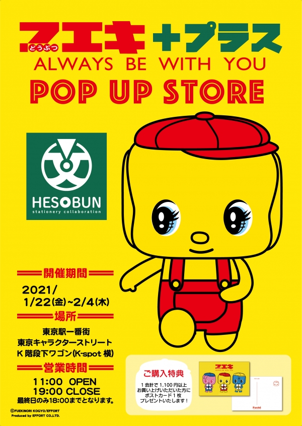 オリジナル商品の企画・制作・販売を軸に、企業・組織のトータルブランディングを手掛ける株式会社ヘソプロダクション(本社:大阪市福島区・代表取締役:稲本ミノル)が運営を手掛ける『フエキショップ-Fueki shop-』が、2021年1月22日(金)〜2月4日(木)までの期間、キャラクターの聖地 東京駅一番街 東京キャラクターストリートにポップアップストア「フエキ+プラス」として登場いたします。