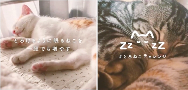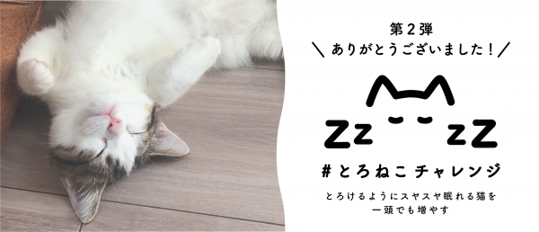 “とろけるようにスヤスヤ眠る“猫の写真や映像、イラストに「#とろねこチャレンジ」というハッシュタグをつけてSNSに投稿すると、1投稿につき10円が保護猫団体に寄付される仕組みです。花王株式会社ハミングLINNEが2020年2月から4月にかけて実施した第一弾と合わせて、累計439,800件の投稿が集まっています。