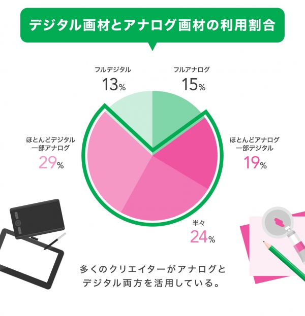 本調査では約7割の方がアナログ画材とデジタル画材を製作フローや作風によって使い分けていることがわかりました。筆感などアナログだからこそできる表現や、多様なブラシや質感を手軽に使えるデジタルならではの表現と、どちらもそれぞれの良さがあります。