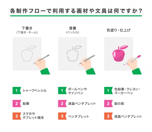 各制作フローで利用する画材や文具について尋ねたところ、下書き(下描き・ネーム)では1位 「シャープペンシル」、2位 「鉛筆」、3位 「スマホやタブレット端末」の順に利用頻度が高く、清書(ペン入れ)では1位 「ボールペンやサインペン」、2位 「液晶ペンタブレット」、3位 「ペンタブレット」、さらに色塗り・仕上げの工程では1位 「色鉛筆・クレヨン・マーカーペン」、2位 「絵具」、3位 「液晶ペンタブレット」という結果になりました。液晶ペンタブレットやペンタブレットは下書き後の工程で利用されることが多いようです。