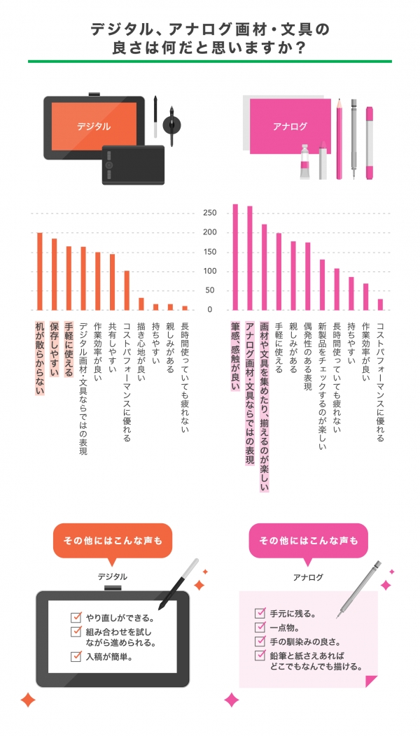 デジタル、アナログ画材・文具の良さは何だと思うか尋ねたところ、デジタル画材は「机が散らからない」「保存がしやすい」「手軽に使える」という回答が上位を占めました。またアナログ画材は「筆感、感触が良い」「アナログ画材・文具ならではの表現」「画材や文具を集めたり、そろえたりするのが楽しい」という回答が上位を占めました。その他、デジタル画材については作業効率やデータ共有のしやすさが良いという回答がある一方で、アナログ画材は手軽に使えることや偶発性のある表現が良いと、画材の特徴をとらえた回答が多くみられました。何度もやり直したり、組み合わせを試したりしながら描き進められるデジタル画材と、作品が一点ものとして手元に残るアナログ画材と、それぞれの画材の良さがあります。
