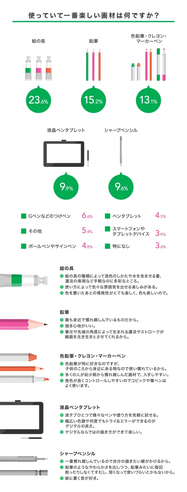 次に使っていて一番楽しい画材を尋ねたところ、「絵具(23.6%)」「鉛筆(15.2%)」、「色鉛筆・クレヨン・マーカーペン(13.1%)」、「液晶ペンタブレット(9.9%)」、「シャープペンシル(9.6%)」が上位5位を占めました。子どものころから慣れ親しんだ画材を選ぶ傾向にある一方で、1台で様々なペンや塗り方を気軽に試すことができる液晶ペンタブレットが楽しいと感じる方も一定数いるようです。