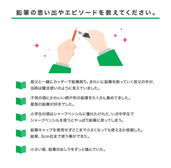 また、最も身近で慣れ親しんでいるという意見が多かった鉛筆は、調査対象者にクリエイターが多いこともあり、「ラフ・下書き」に使うことが多いという結果になりました。使い分けや力の込め方、角度の違いなので多彩な表現ができることも画材として選ばれる要因のようです。さらに「温かみがあり、親しみもある」とその魅力を感じる方も多く、カッターで鉛筆を削ったことや、かわいい鉛筆を集めたなど、共感できる懐かしい思い出があることも鉛筆が愛される理由かもしれません。