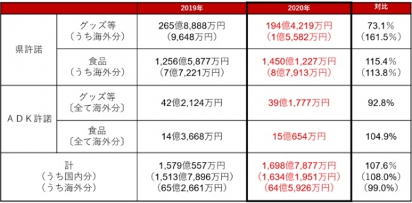 国内外でグッズなどの売上は減少しましたが、野菜や畜産物、調味料などの食品関連、マスクやフェイスガードといった商品の需要が高まった結果、全体売上が前年比で1.07倍増加しました。