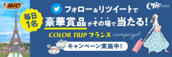 ホーム > オフマガ ニュース一覧 > BICジャパン、Twitterフォロー&リツイートで豪華賞品が抽選で毎日当たる!クリックゴールド15色で巡る「COLOR TRIPフランス キャンペーン」