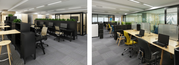 今回のリニューアルではオフィスワークとテレワークの併用を前提に、ポストコロナ時代の新しいオフィスや働き方に求められる要素や機能、座席形態などを最適化し、「求心力」のあるオフィスを具現化しています。