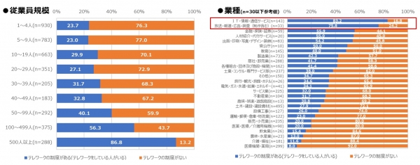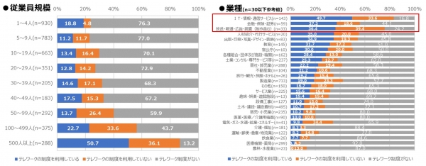 ・従業員規模別では、規模が大きくなるにつれて、テレワーク制度の導入率が高くなる傾向