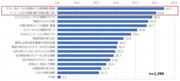 ・テレワーク時の課題では、「デスク、椅子、ネット回線など、作業環境の整備」が最も高く、54.5%