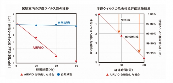 浮遊ウイルスの除去性能評価試験においてAIRVIO稼働後27分で99%、54分で99.99%ウイルスの減少を確認
