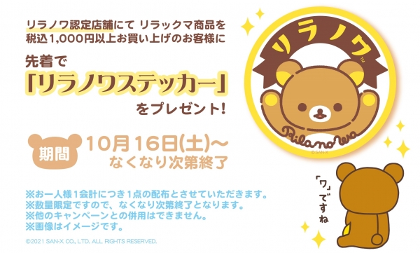 「リラノワ」スタート記念の第一弾として、リラノワ認定店舗にて、リラックマ商品を1,000円以上(税込)お買い上げの方に、先着で「リラノワステッカー」をプレゼントするキャンペーンを実施いたします。