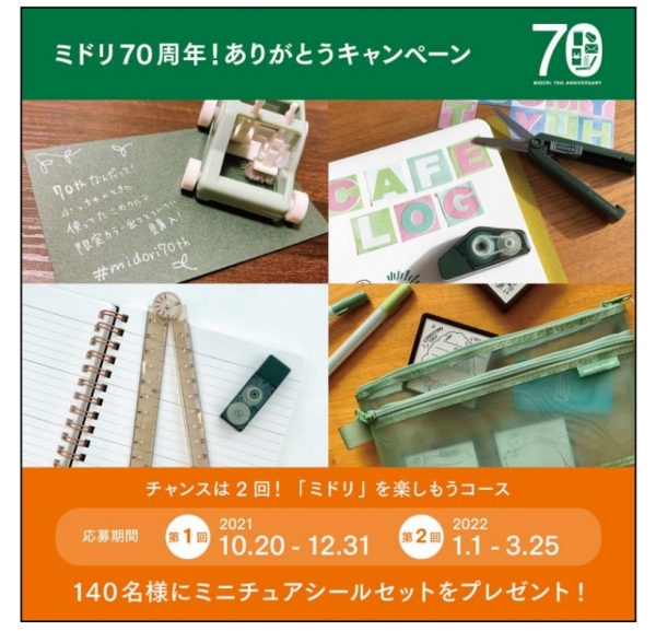 この度、当社が展開するプロダクトブランド「ミドリ」の 70 周年を記念し、「ミドリ」のインスタグラム公式アカウント「文具のミドリ」(@midori_designphil)では、70 周年限定アイテムをお買い上げいただいた方を対象とした<「ミドリ」70 周年!ありがとうキャンペーン>を 2021 年10 月20 日(水)から 2022 年3 月25 日(金)に開催いたします。