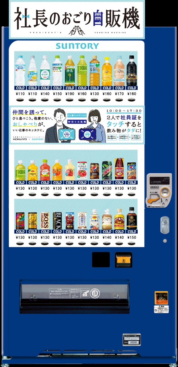 コクヨ株式会社(本社:大阪市/社長:黒田 英邦)は、サントリー食品インターナショナル株式会社(以下、サントリー)が開発した法人向け新サービス「社長のおごり自販機」を、コクヨの働き方の実験場「THE CAMPUS」にて試験導入し、実証実験を実施しました