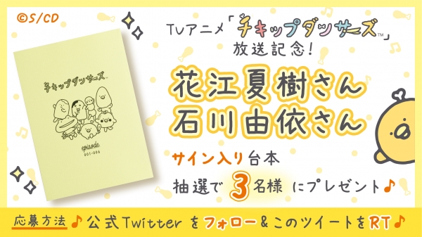 10月5日からNHK Eテレにて放送スタートした、『チキップダンサーズ』の公式Twitterアカウントをフォロー、対象のツイートをリツイートいただいた方に、「声優の花江夏樹さん・石川由依さんのサイン入り台本」が抽選で3名様に当たるキャンペーンを実施しております。