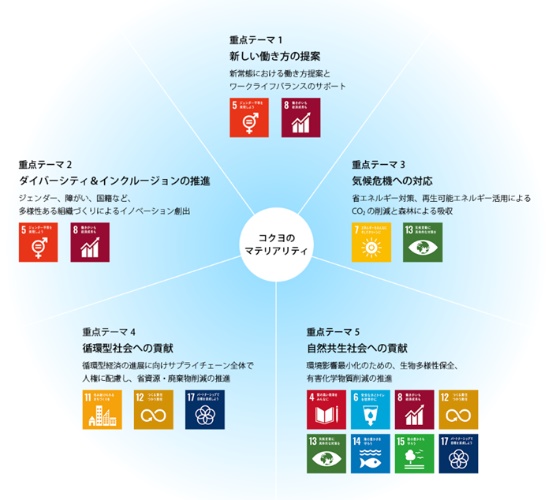 コクヨは、1993年にコクヨ環境行動憲章を策定し、環境への配慮を取り入れた製品開発を推進しています。2021年には事業を通じた社会的課題解決への取り組みをさらに加速させるため、特に注力すべき5つのマテリアリティを特定しました。