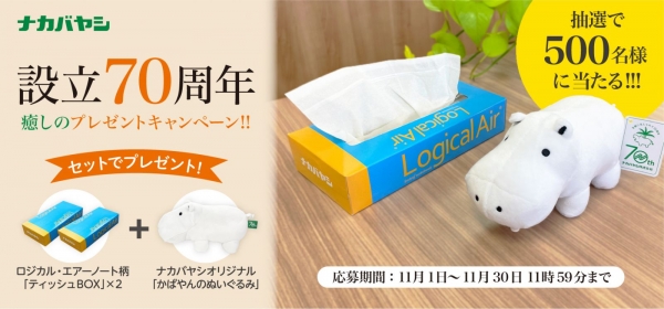 ナカバヤシ株式会社は、Webアンケートとクイズにお答えいただいた方の中から、抽選で500名様に、設立70周年を記念して製作された「かばやんぬいぐるみ(非売品)」をプレゼントする【癒しのかばやん!プレゼントキャンペーン】を実施します。
