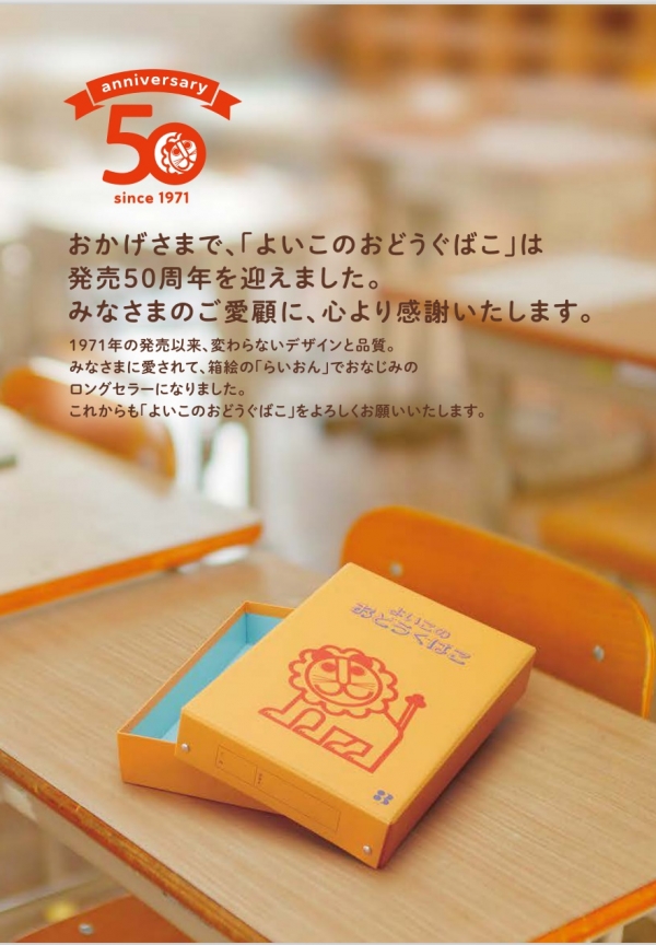 50周年を迎え、記念ロゴを作成いたしました。商品パッケージや販促物などで展開して参ります。リボンに50年の感謝をこめて、そして、「よいこのおどうぐばこ」の変わらぬ品質と信頼を象徴する「らいおん」が新たな始まりを「0」の窓から見据えています。