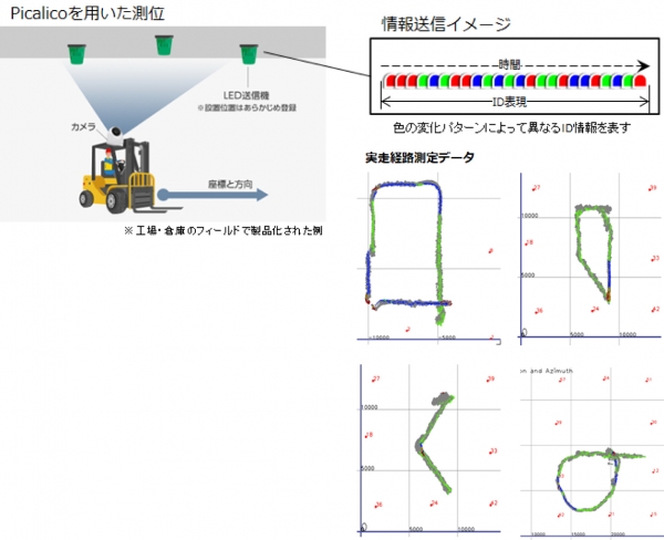 当社は、LED灯の発光色を変化させて信号を送信する独自の「カメラ可視光通信」を使い、主に工場の自動搬送機や台車、倉庫のフォークリフトなど作業動線の分析や所在管理に活用できる高精度の位置測位システムとして『picalico』を開発し、2019年3月より提供を開始しています。