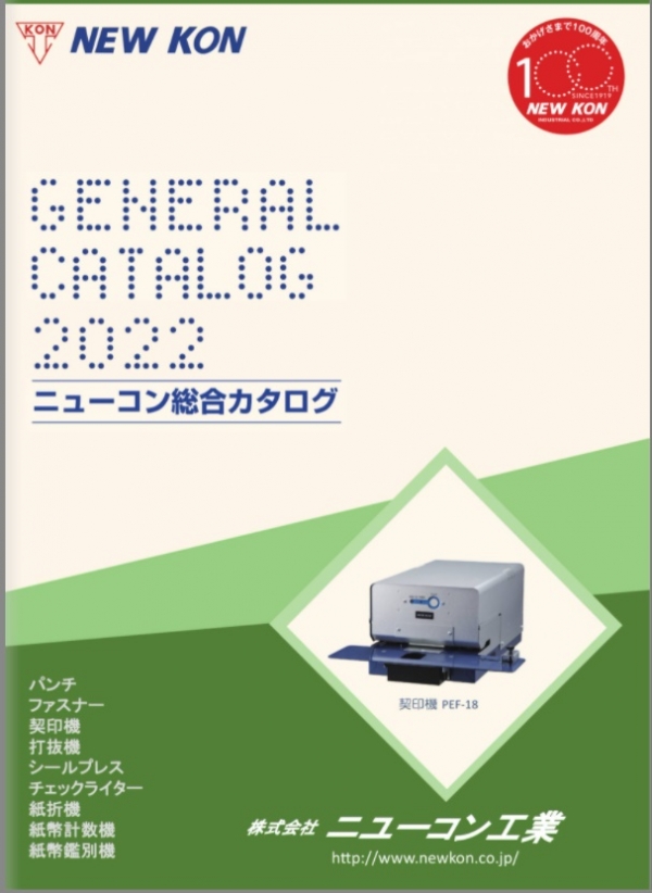 同カタログには、パンチ・エコロジーファスナー・シールプレス・打抜機・抹消機・契印機・チェックライター・紙幣計数機・紙折機・紙幣鑑別機・消耗品を掲載。