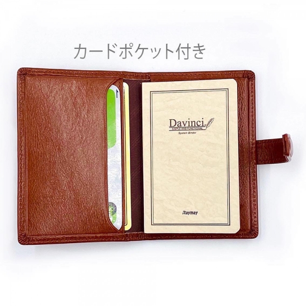 本体サイズは、高さ99×幅75mmで、カバーの形状と素材は「スーパーロイス」そのもの、植物性タンニン鞣しを施した本格派です。表紙の内側にカードが収納できるポケットとメモノートが付いているので、実際に使用してカバーの経年変化を楽しむことが出来ます。