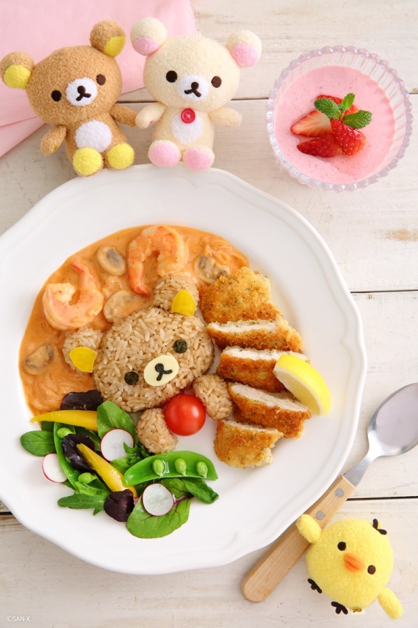 リラックマの顔がかわいく作れちゃう!味付ごはん付きの「リラックマの海老トマトクリーム煮」や、フライパンで簡単に手軽に時短で作れる「ハーブチキンカツ&サラダ」、コリラックマが大好きないちごを使った「いちごのベリームース」など、リラックマがいっぱいのメニューです♪