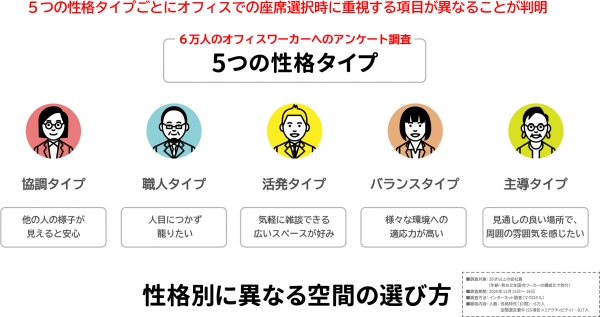 そこで両社は、「ワーカーの性格タイプが座席選択に影響している」という仮説を立て、オフィスワーカー6万人を対象としたWebアンケートを実施しました。その結果、ワーカーの性格タイプを特徴的な5つのグループに分類できることが明らかになりました。
